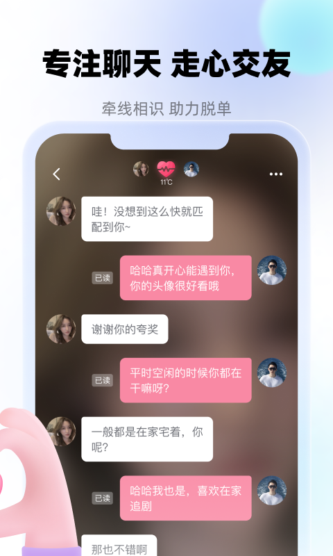 同城约会单身人士的交友软件,附近聊欢,一键匹配附近的人,跟心仪的女生帅哥约会,让你摆脱深夜孤独。